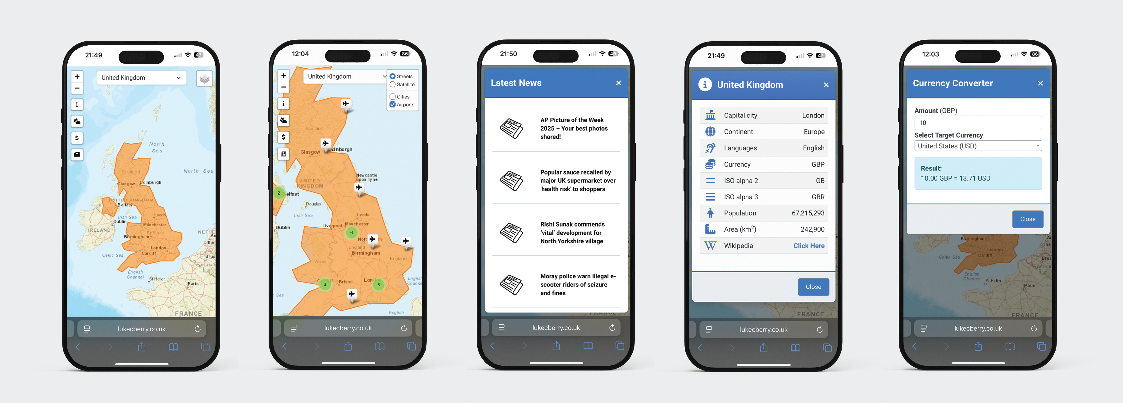 This interactive map project provides an engaging way to explore geographical data. Users can select a country from the dropdown menu to dynamically view detailed information about the selected region. Features include city and airport locations, a country overview, current weather updates, and the latest news. Additionally, a built-in currency calculator enhances the experience, offering practical functionality alongside the geographical insights.